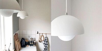 Trine har valt Flowerpot VP1 från &tradition som belysning ovanför köksbordet. Lampan är vacker ovanför matbordet - oavsett om den hänger ensam, i par eller flera på rad. Den kan därför användas över både små och stora arbetsytor och ger utmärkt ljus över både stora och små matbord. Den populära lampan finns nu i olika storlekar och ett brett utbud av vackra färger. Den vita VP1 ger en elegant och stilren look till Trines nordiska inredning.