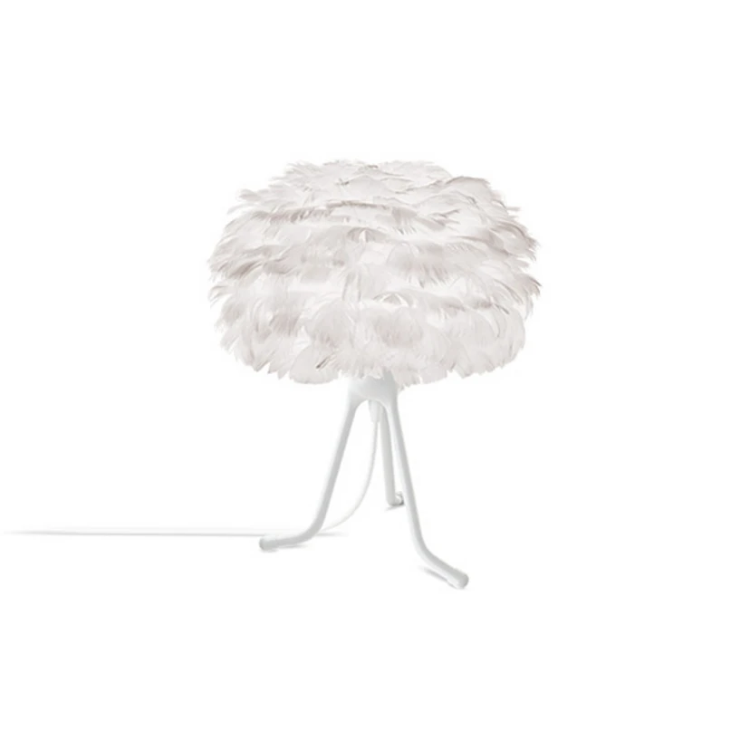 Eos Table Lamp w/Mini Base White/White från Umage är en unik lampa tillverkad av gåsfjädrar. Fjädrarna gör att ljuset flödar mjukt och vackert från lampan och även när den inte är tänd är den ett konstverk att titta på.