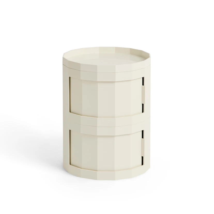 Skåpet är tillverkat av återvunnet ABS-material och kombinerar hållbar produktion med tidlös design. Den krämfärgade ytan passar in i olika bostadsutrymmen och gör möbeln till både ett praktiskt förvaringsutrymme och en estetisk höjdpunkt. Funktionalitet, rörlighet och design möts här på ett perfekt sätt.