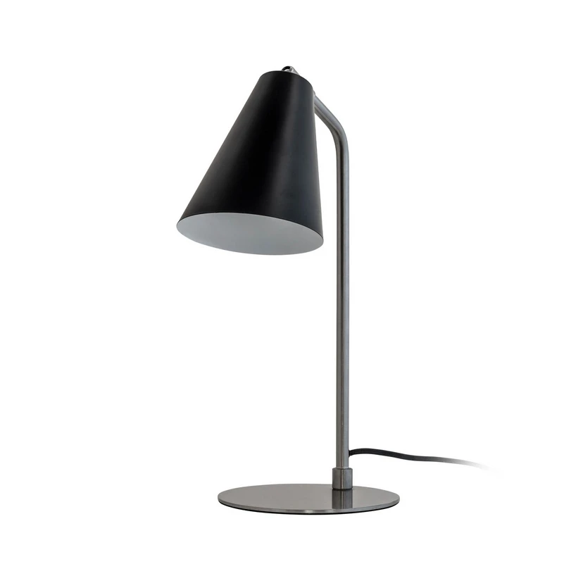 Oswald Table Lamp Black/Steel presenterar sig i en modern design som är både enkel och karaktärsfull på samma gång. Lampan kännetecknas av en mörk färgskala med en blank stålram och en svart lampskärm som har en asymmetrisk design med sluttande linjer. Detta ger lampan en karaktärsfull kant och sätter en modern prägel på den konventionella lampdesignen.